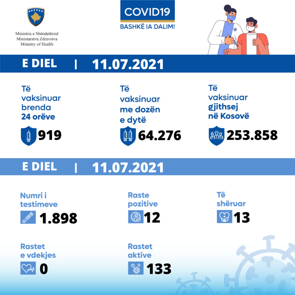 Gjatë 24 orëve të fundit, në Laboratorin e Mikrobiologjisë Molekulare në IKSHPK dhe laboratorët private me metodën RT-PCR, si dhe laboratorët publike dhe private me metodën RAT, janë testuar gjithsej 1,898 mostra të marra nga SHSKUK dhe gjurmimi i kontakteve të rasteve në terren, prej të cilëve rezultojnë 12 raste pozitive.