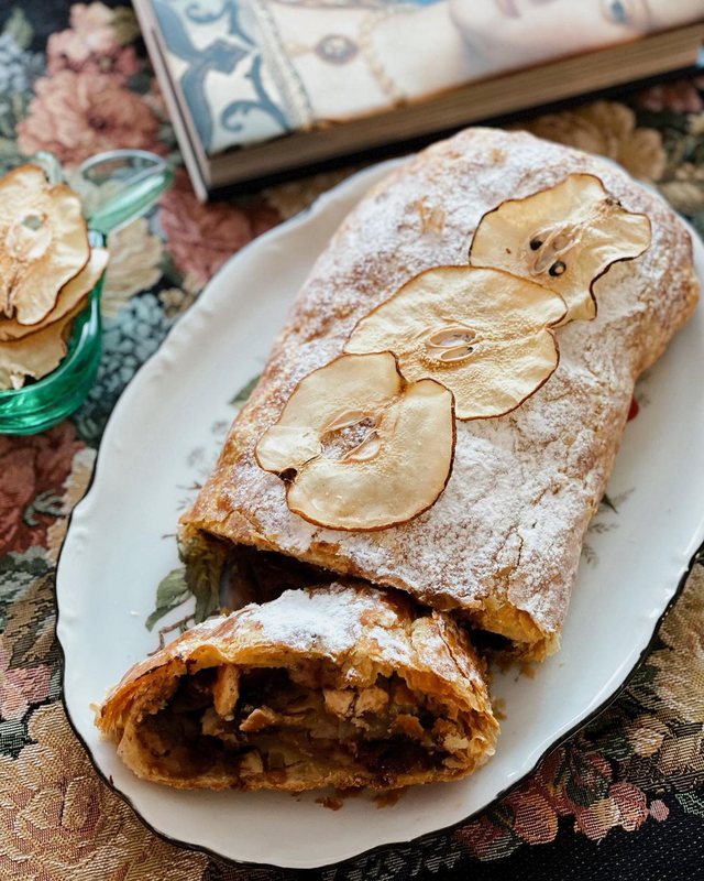 PÊRGATITJA: Prisni çokollatën dhe bajamet e pjekura në copa, i përzieni me dardhat e pastruara dhe të prera imët, sheqerin edhe kardamonin pluhur. Shtroni petën sfoliatë, thërmoni sipër biskotat dhe mbusheni me masën e krijuar. Mblidhni anët dhe pastaj rrotullojeni me kujdes ku pjesa fundore të jetë poshtë që mos hapet gjatë pjekjes dhe e lyeni me të verdhën e vezës. Në furrë të parangrohur me 180 gradë për 40 minuta. Pasi ftohet e shërbeni me sheqer pluhur dhe feta dardhe. /Living